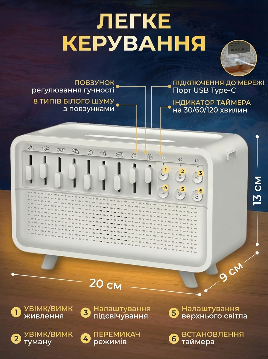 Звуки природи та білий шум. Вбудовані звуки дощу, багаття, океану та співу птахів допоможуть швидко заснути дітям та дорослим. Також можна підключити телефон через Bluetooth і слухати свою музику.