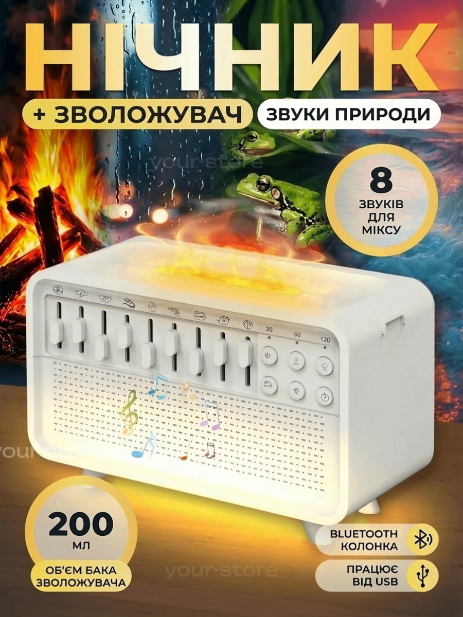 Магія затишку 3-в-1. Цей пристрій поєднує функції зволожувача повітря, нічника з ефектом "живого вогню" та Bluetooth-колонки. Ідеально підходить для спальні, дитячої кімнати або робочого місця. Створює неймовірну атмосферу для релаксу.