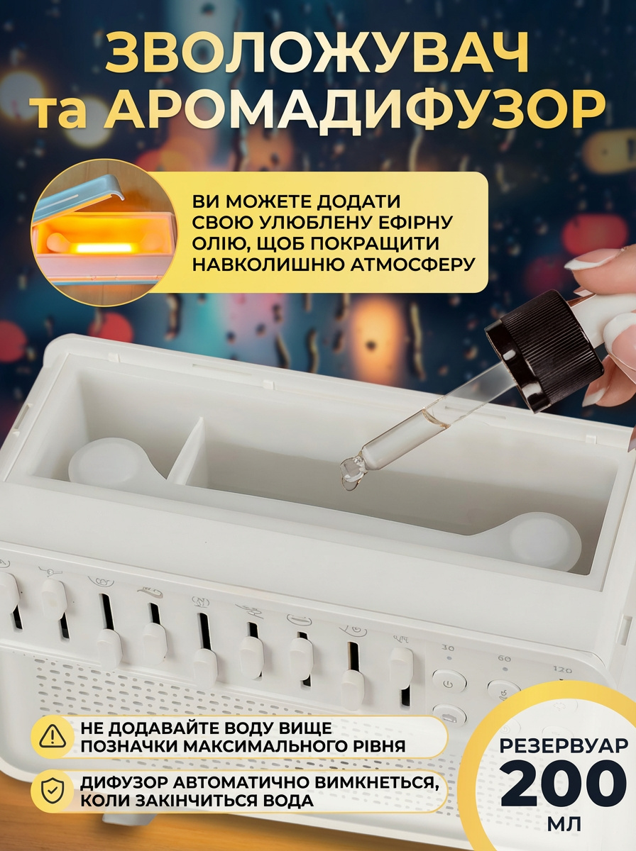 Ароматерапія та таймер. Додайте кілька крапель ефірної олії у воду, щоб наповнити кімнату приємним ароматом. Є функція таймера на 1, 3 або 6 годин та автовимкнення без води.